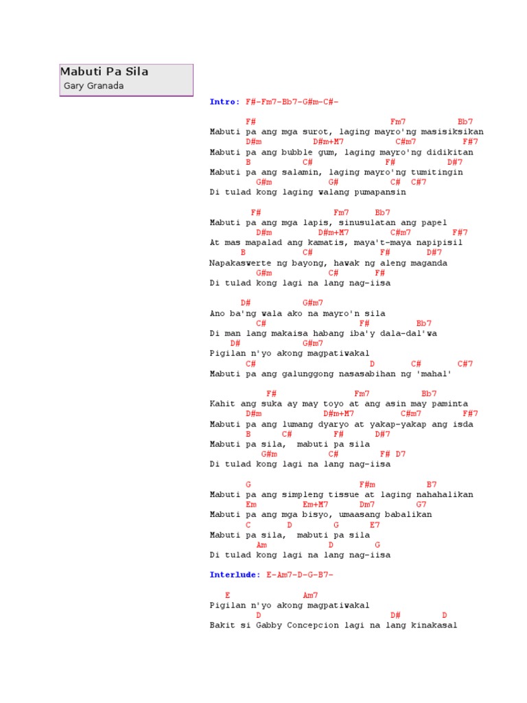 Free printable and easy chords for song by Gary Granada - Mabuti Pa Sila. Play over 265 million tracks for free on SoundCloud. Mabuti Pa Sila Lyrics.