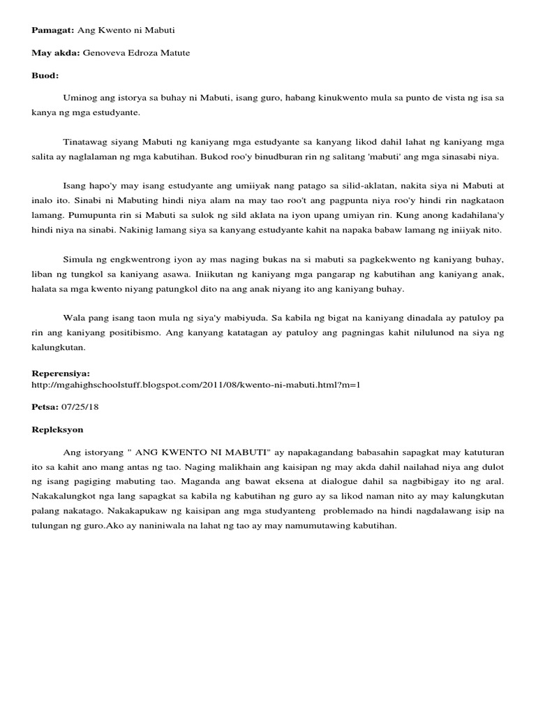 Panimula- Ang paglalarawan ng tagapagsalaysay sa kasalukuyang kalagayan o ang kasalukuyang kinaroonan ni Mabuti ang kanyang dating guro. Ang kwento ni mabuti ni genoveva edroza matute buod. Dahil sa angking husay sa pagtuturo at mabuting kalooban.
