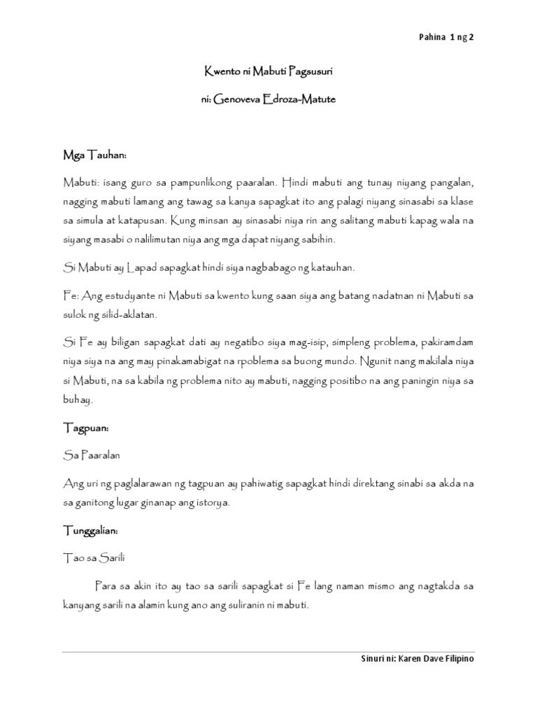 Ngunit nais ng gurong ito na ang makita at tumatak sa isip ng kanyang mga mag - aaral ay ang pagiging mabuti at hindi ang pagiging miserable ng kanyang buhay. Ang kwentong Ang Kwento ni Mabutiay may uri napangkatauhan sapangkat tinitingnan natin ang katauhan ni Mabuti sa kwento. Ortega Memorial City of Iriga PAGSUSURI SA MAIKLING KWENTONG Ang Kwento ni Mabuti katha ni Genoveva Edroza-Matute I.
